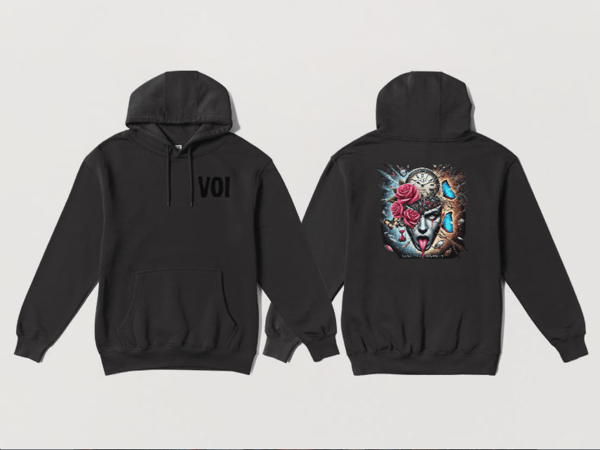 This hoodie is your wearable existential crisis. The front features the modest “VOI” logo—a quiet nod to the chaos you embrace. The back, however, goes full sensory overload: a faceless figure, roses, clocks, butterflies, and something dripping (probably sanity). It’s a graphic reminder that life’s a mess, and you might as well wear it.